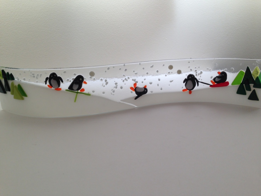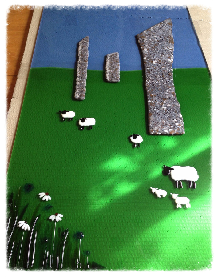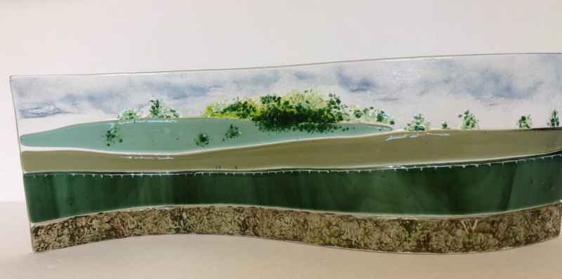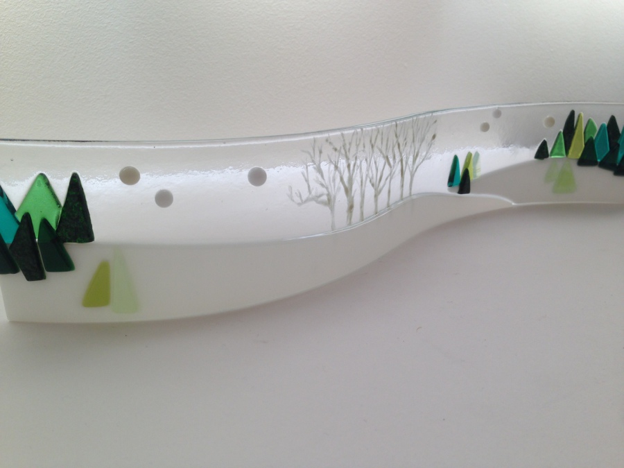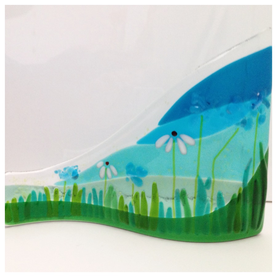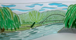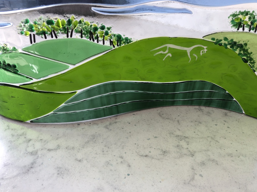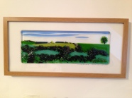 The brief for this commission was for cherry blossom trees, a stream, maybe a waterfall, and fields. It is a large picture...120cm in length. Panels were fused in sections, in our kiln, and each panel needed several firings to build the picture. The panels were then mounted onto a made to measure frame made by Mark Williams of Wootton Bassett.