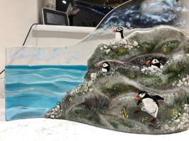 Commission for a puffin picture incorporating waves, rocks and puffins.