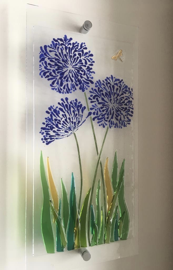 Agapanthus plants are very popular and make stunning subjects in glass. This wall hanging is similar to the one we made in the summer but has a simpler hanging arrangement, and is a little smaller.