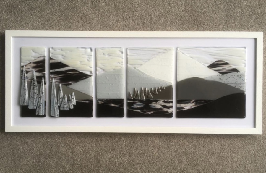The brief was to make a large rectangular Mountain picture using black. grey and white, and no colour. Hilary used textured glass as well as streaky glass to get the desired effect. The recipeint was delighted with the result for his bachelor den.